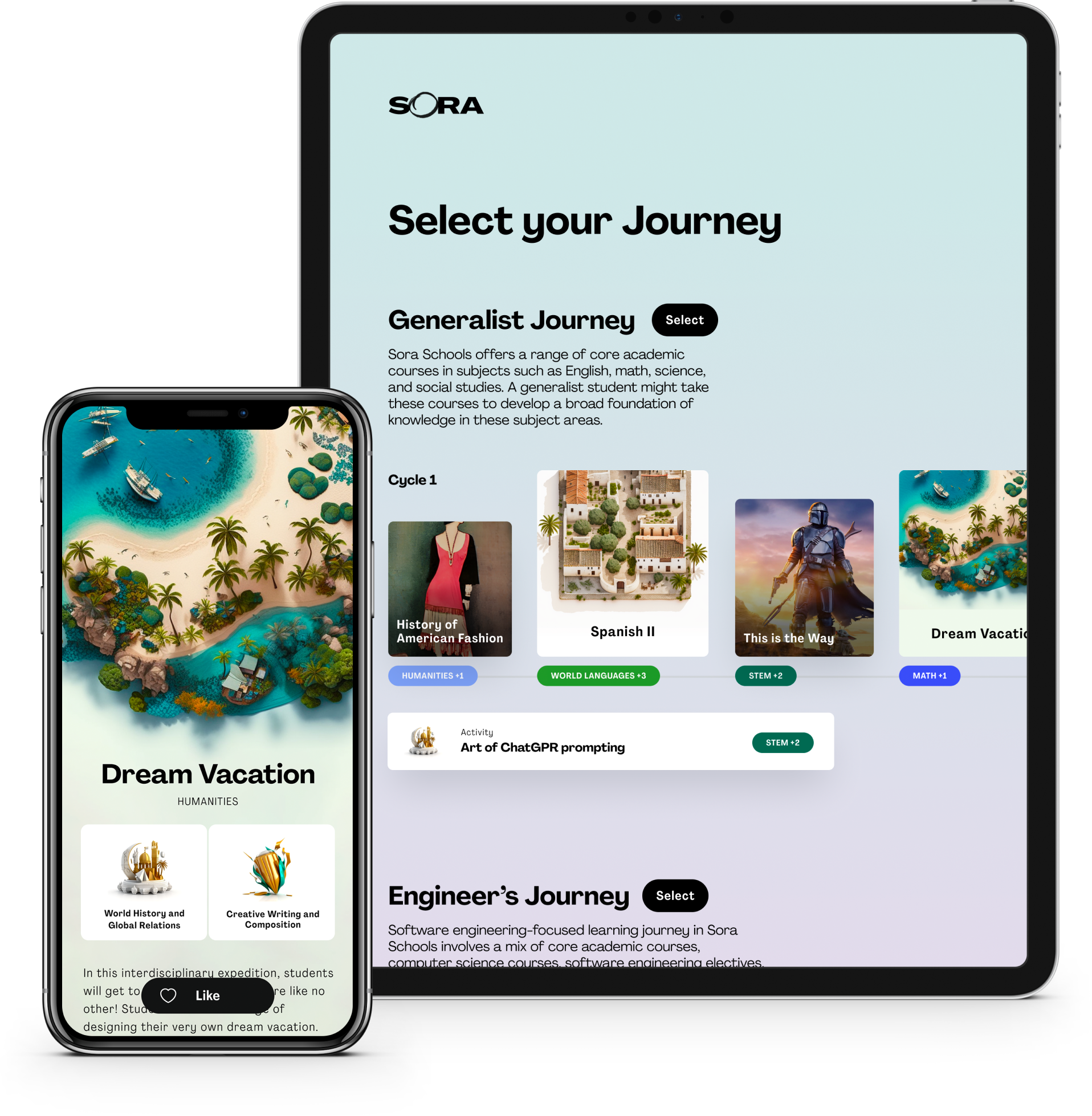 Sora Schools is an innovative, fully online school designed to make learning flexible, engaging, and tailored to each student’s interests. Instead of traditional lectures, students work on real-world projects, collaborate in small groups, and explore topics that inspire them — all the while meeting rigorous academic standards. With a mastery-based approach and a supportive community, Sora empowers students to take ownership of their education and prepare for the future on their own terms.
